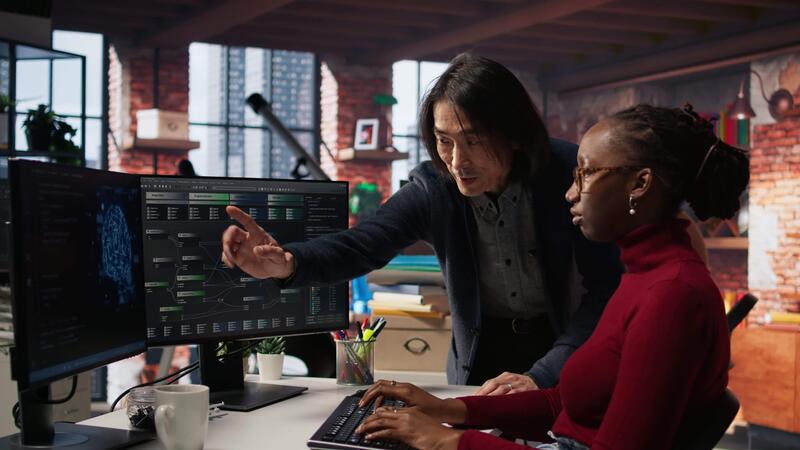 Man in AI startup office CTO position overseeing software engineer implementing machine learning. Artificial intelligence tech venture supervisor helps employee fix code bugs, camera A Pro Video