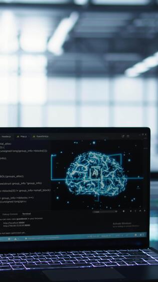 Vertical Laptop in front of data center engineers in blurry background deploying artificial intelligence driven management tools. AI driven notebook used for overseeing server clusters, camera B close up Pro Video