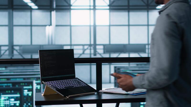 Technician in data center using AI on laptop and tablet, developing disaster recovery plans. Server farm employee using artificial intelligence tech on devices, testing failover scenarios, camera A Pro Video