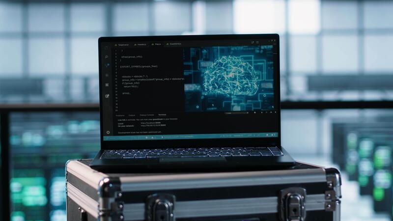 Laptop in front of data center engineers in background deploying artificial intelligence tools. AI coding on notebook screen next to technicians inspecting server clusters, camera A close up Pro Video