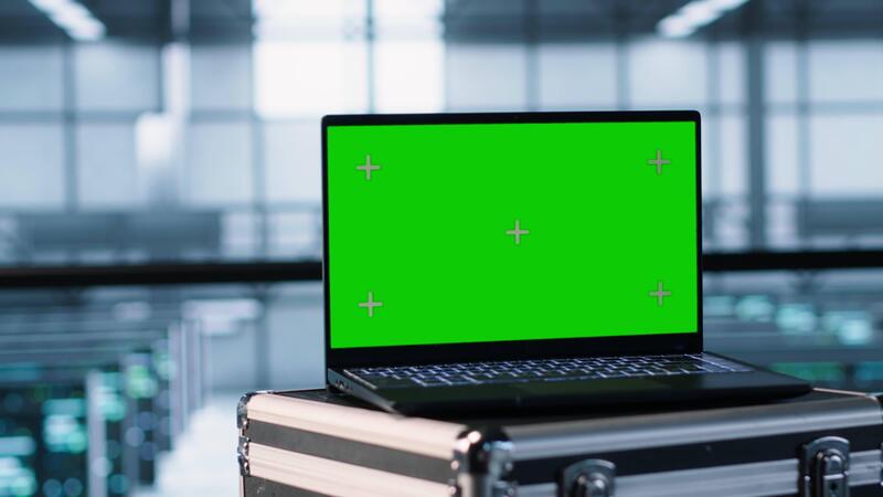 Green screen laptop in front of data center engineers in blurry background calibrating energy usage, inspecting servers configuration, supporting sustainable infrastructure, camera A Pro Video