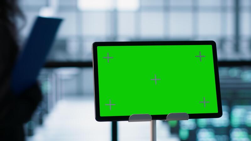 Close up of chroma key tablet next to server room data scientists conducting security audits, preventing bugs. Green screen device and man working with colleague in data center, camera A Pro Video