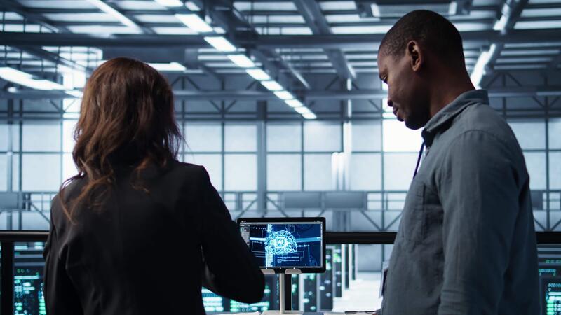 Manager meeting with client in data center using artificial intelligence tech, reaching deal. People doing handshake in AI based server farm after checking files and finishing transaction, camera B Pro Video