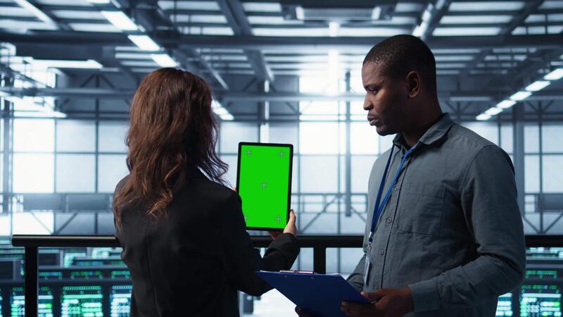 Computer scientists in data center use mockup tablet, inspecting server rigs, updating devices. Teamworking IT colleagues collaborating to ensure stable operations, using chroma key device, camera B Pro Video