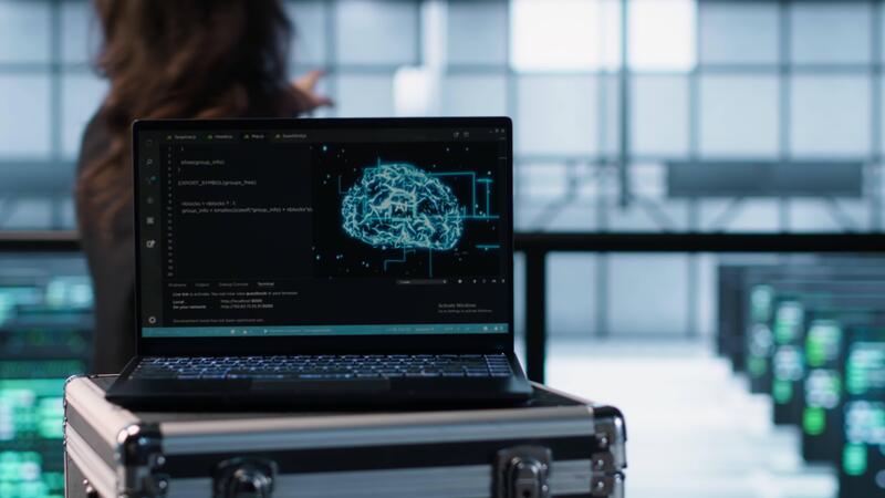 Artificial intelligence technology coding on laptop in data center with programmers in background employing machine learning models. Notebook used by AI IT experts, camera A close up Pro Video