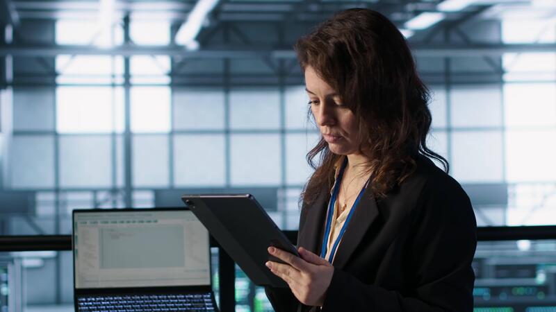 Technician in data center with tablet integrating AI driven automation tools, running predictive maintenance routines. Woman ensuring continuous uptime of server room, managing data flows, camera A Pro Video
