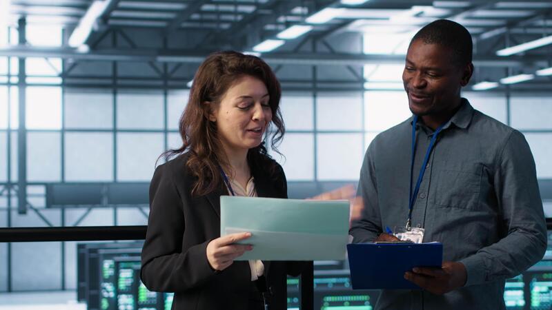 IT professionals in data center reviewing reports and files, crosschecking network performance metrics and security logs. Server room workers doing troubleshooting to prevent downtime, camera A Pro Video