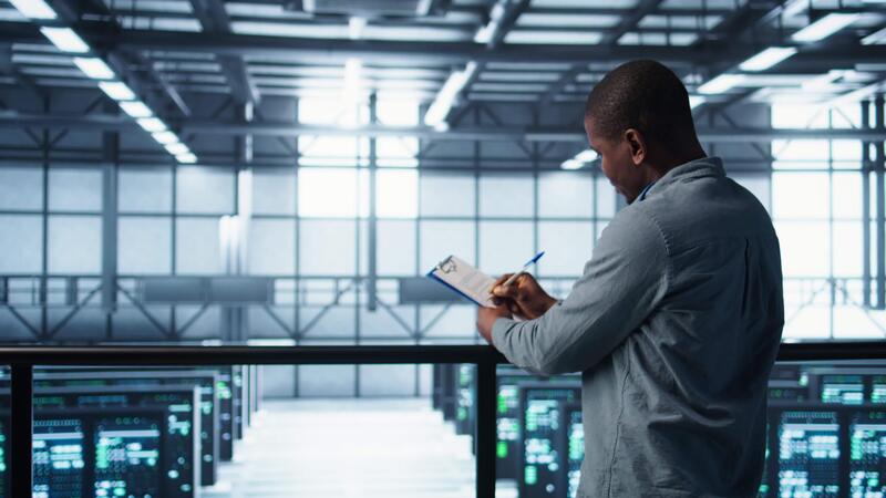 Cheerful admins meeting in data center to review reports and files, doing handshake. Server room employee saluting colleague, doing troubleshooting to prevent downtime, camera B Pro Video