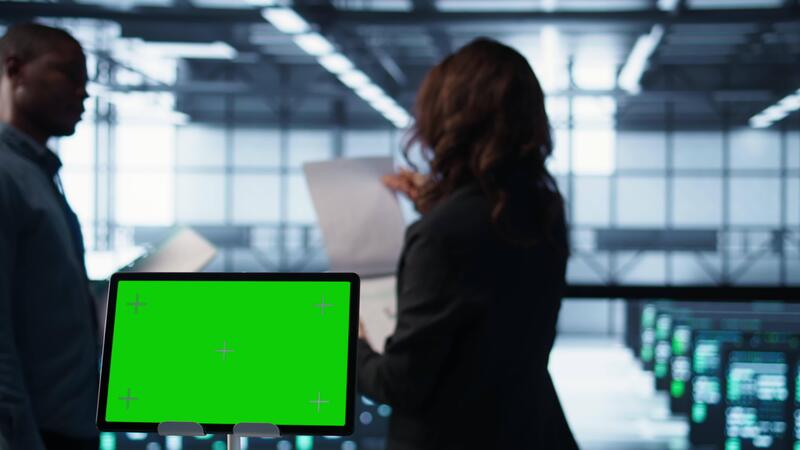 Close up of chroma key tablet next to server room data scientists conducting security audits, preventing bugs. Green screen device and man working with colleague in data center, camera B Pro Video