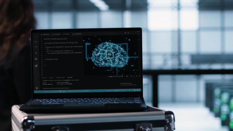 Laptop in front of data center engineers in blurry background deploying artificial intelligence driven management tools. AI driven notebook used for overseeing server clusters, camera A close up Pro Video