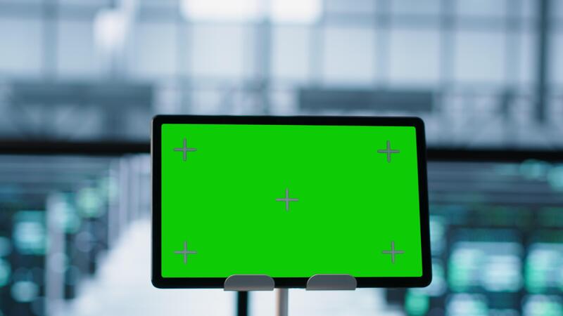 Close up of chroma key tablet and teamworking programmers in server room adjusting power management settings. Focus on isolated screen mockup device in front of data center technicians, camera A Pro Video