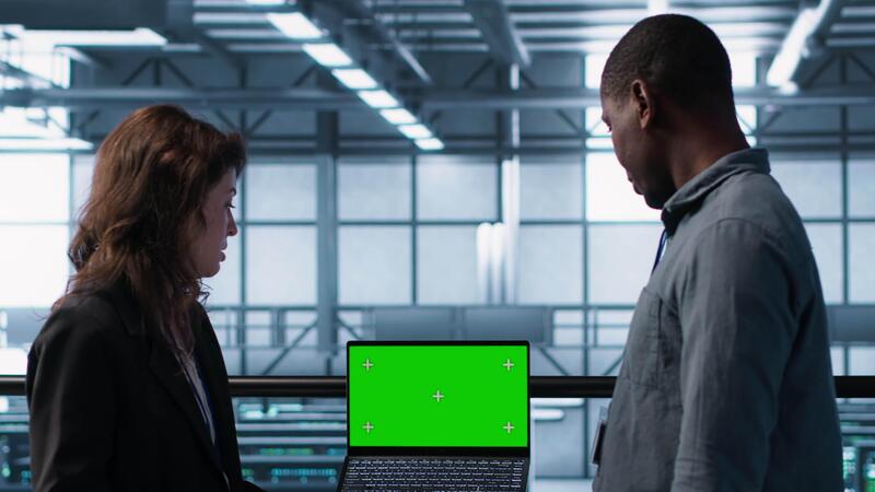 Data center team of computer scientists using mockup laptop to review equipment diagnostics. Teamworking IT experts adjusting server room configurations using chroma key notebook, camera A Pro Video