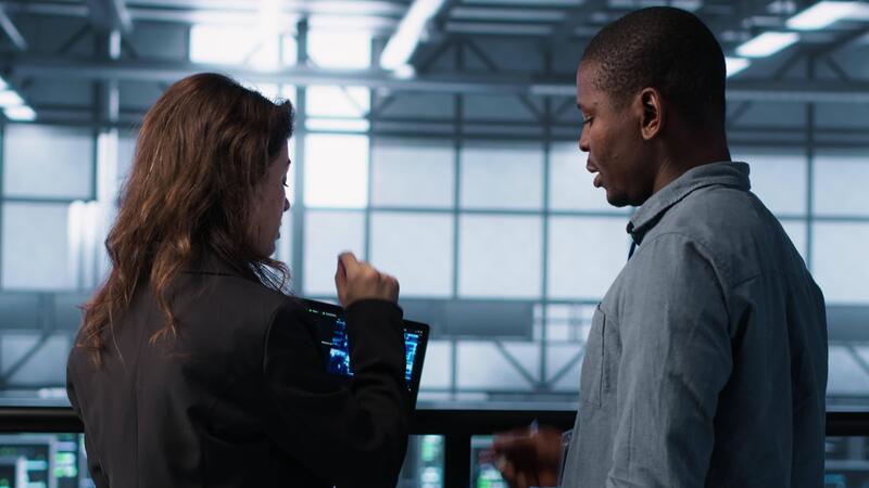 Data center system administrators using artificial intelligence neural networks tech on tablet. Teamworking server farm employees using AI programming language on device screen, camera A Pro Video