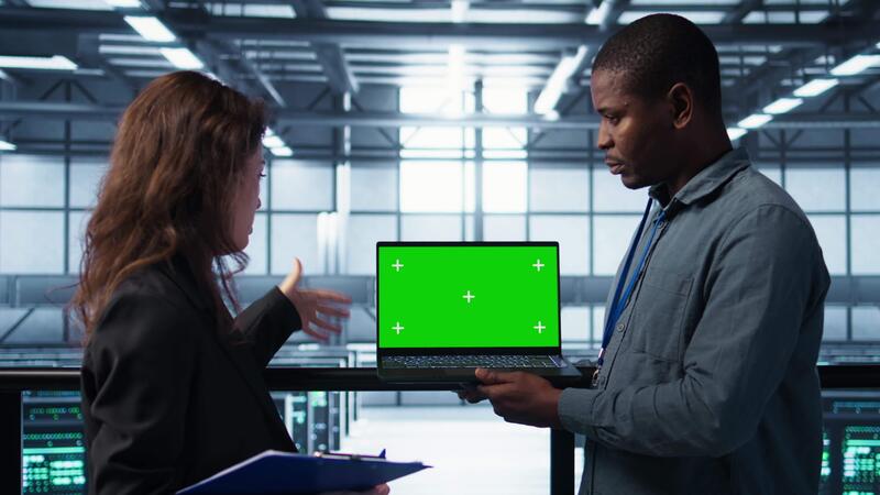 Engineering team in data center using green screen laptop, implementing predictive analytics scripts, reviewing equipment health, adjusting system parameters, coordinating maintenance tasks, camera B Pro Video