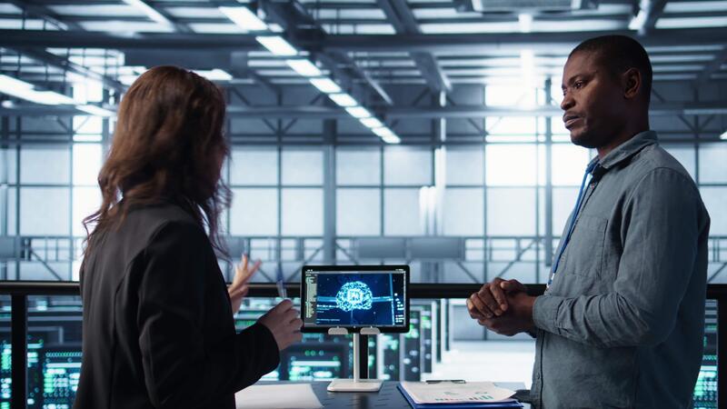 Team of engineers in data center with tablet integrating AI driven automation tools, doing maintenance. Teamworking colleagues in server room using artificial intelligence, camera B Pro Video