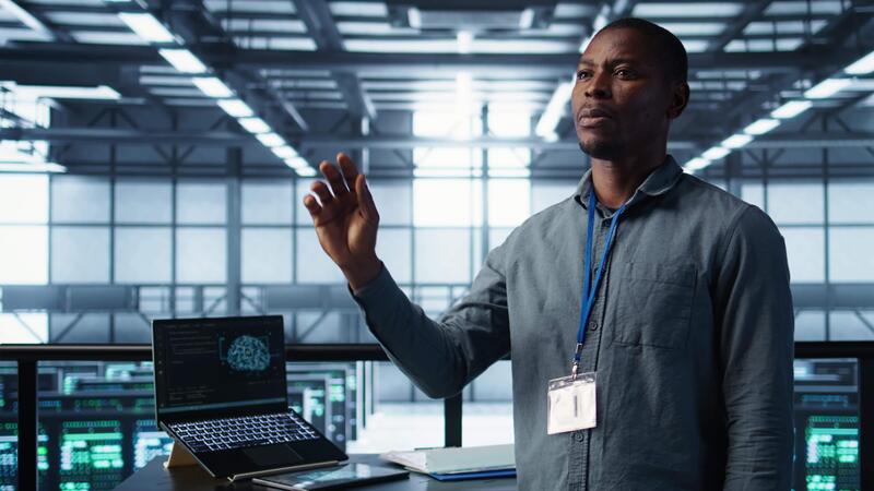 Computer scientist looking at holograms in data center, using artificial intelligence. African american admin interacting with augmented reality AI visualization in server hub, camera B Pro Video