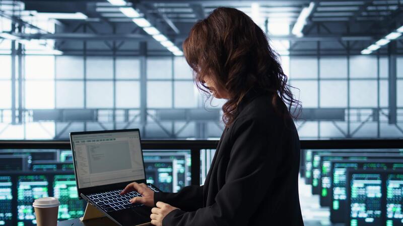 Admin in data center using laptop to update storage arrays, configuring network virtualization. Woman in server room holding coffee cup, verifying settings to maintain stable performance, camera B Pro Video