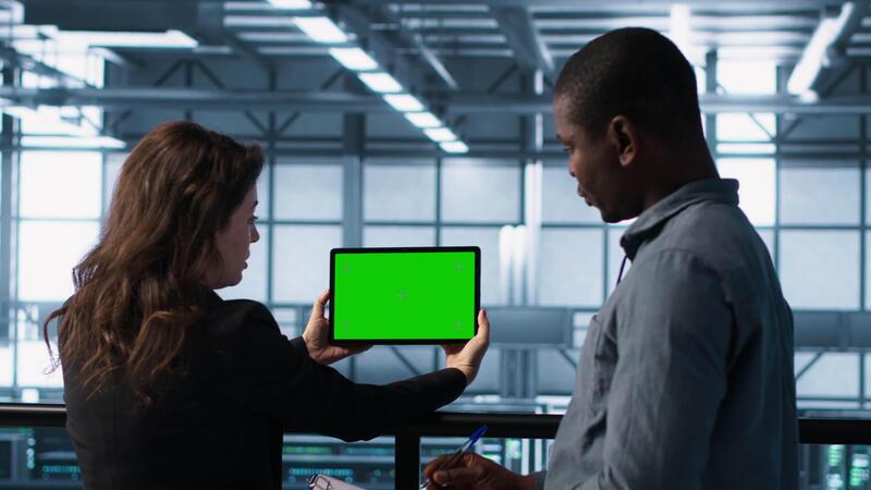 System administrators in server farm using isolated screen mockup tablet to verify settings. Data center colleagues using green screen chroma key device to monitor facility, camera A Pro Video