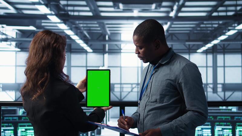 Engineers using green screen tablet in data center, checking infrastructure reliability, writing in clipboard. Workers using mockup device in server room, managing server virtualization, camera B Pro Video