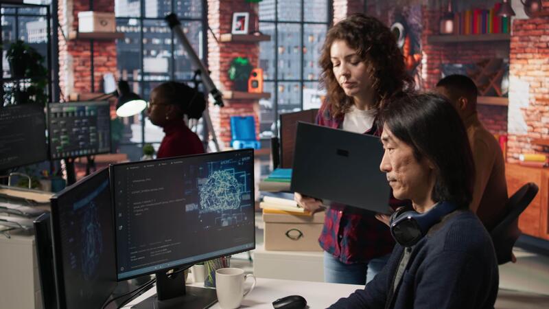 IT engineers cooperating in AI focused startup, debugging applications, crosschecking between PC and laptop. Coworkers doing code testing and quality assurance on devices, camera A Pro Video