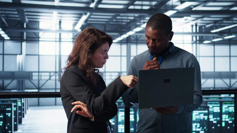Developers in data center workspace coding on laptop, analyzing metrics, optimizing storage volumes. Teamworking IT professionals in server room using notebook, ensuring seamless operations, camera B Pro Video