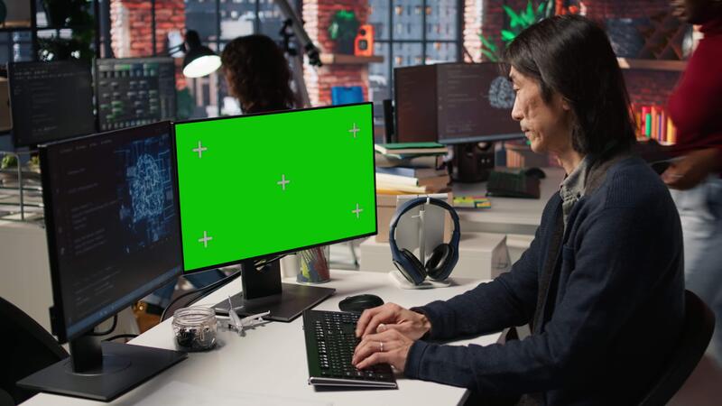 Chief technical officer uses mockup PC in AI tech company providing software development services. Startup IT expert uses AI to streamline coding process on green screen PC, camera A Pro Video
