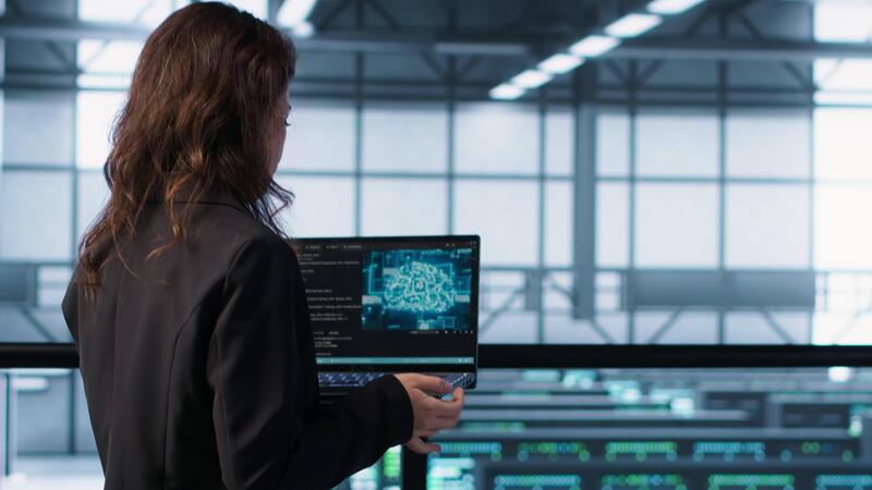 AI technology used by data center software developers reviewing equipment diagnostics. Programmers coding on laptop using artificial intelligence, adjusting server farm configurations, camera A Pro Video