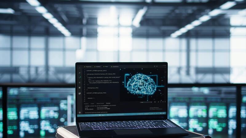 Artificial intelligence technology coding on laptop in data center with programmers in background employing machine learning models. Notebook used by AI IT experts, camera B close up Pro Video