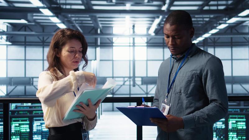 Data center team reviewing paperwork files in high tech server room, analyzing critical system reports and security protocols. Server room admins looking over financial documents, camera B Pro Video