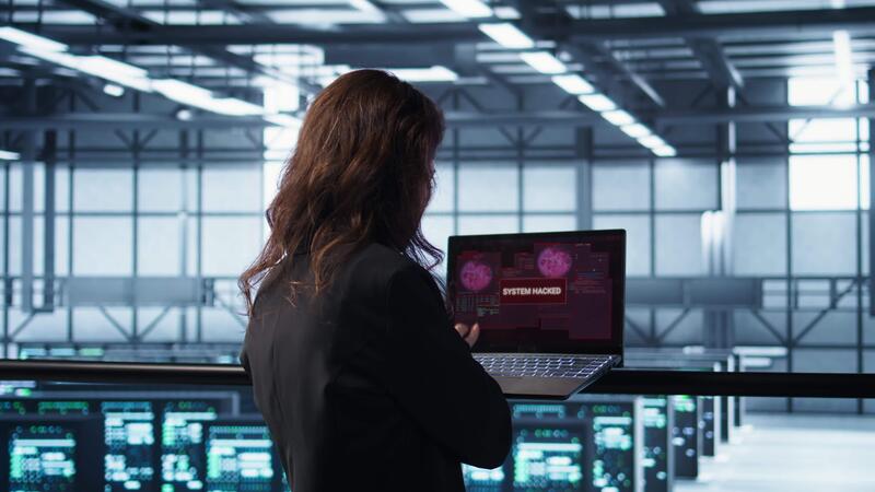 Cybersecurity expert in data center frantically trying to counter a hacker attack. Server room worker under pressure to secure sensitive information after threat alert received on laptop, camera B Pro Video