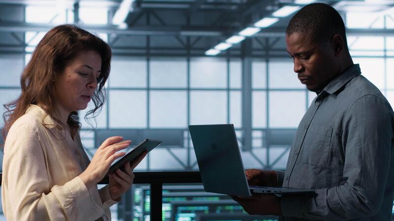 Portrait of happy system administrators in data center using devices, verifying firewall configurations. Jolly teamworking IT experts performing equipment vulnerability scans in server hub, camera A Pro Video