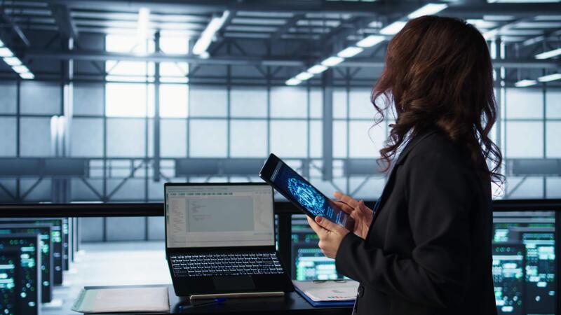 Technician in data center with tablet integrating AI driven automation tools, running predictive maintenance routines. Woman ensuring continuous uptime of server room, managing data flows, camera B Pro Video