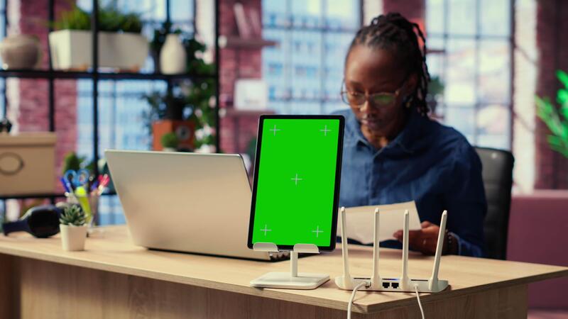 Black girl tries to fix an Wi Fi error by rebooting router next to isolated screen, troubleshooting signal loss problems to solve technical issues. Testing different configurations. Camera B. Pro Video