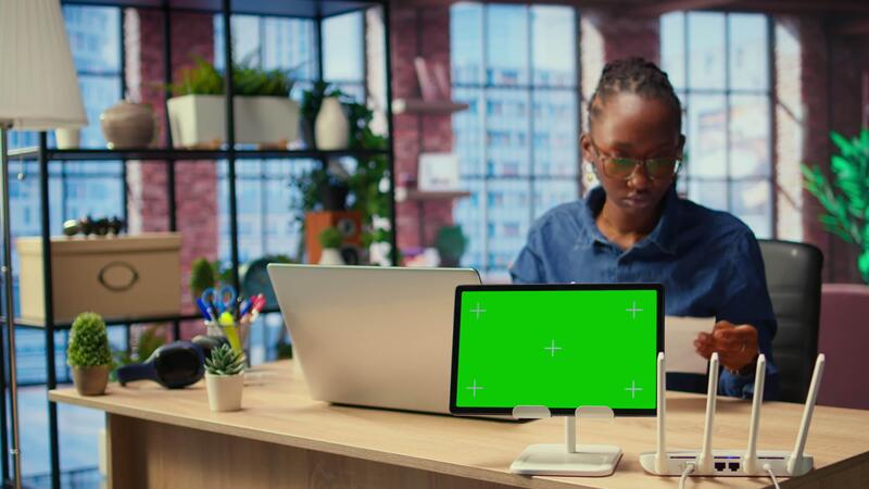 African American female freelancer browse troubleshooting guide next to copy space, working on debugging router issues to restore home network. Young woman struggles to solve tasks. Camera A. Pro Video