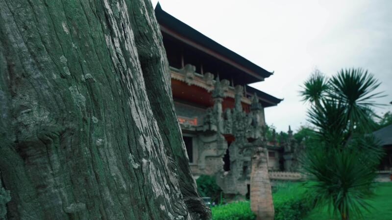 A close-up view of a textured tree trunk in the foreground, with a traditional Asian building in the background surrounded by lush greenery and palm plants Pro Video