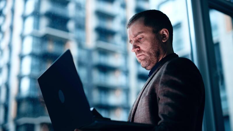 Portrait of Busy, confident Male Using Laptop Computer to Analyze How to Proceed with the Artificial Intelligence Software. Casually Chatting in High Tech Research Office Pro Video