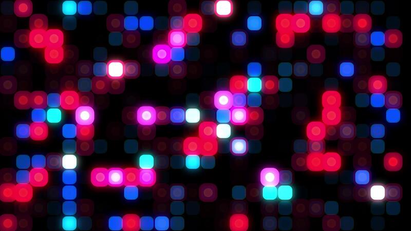 Retro style abstract animation of colorful glowing squares and circles moving across a black backdrop, creating a vibrant, dynamic effect. Pro Video