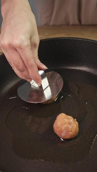 Round ball of minced chicken is placed on hot surface of a pan and pressed down to give it the desired shape, creating a patty. vertical Pro Video