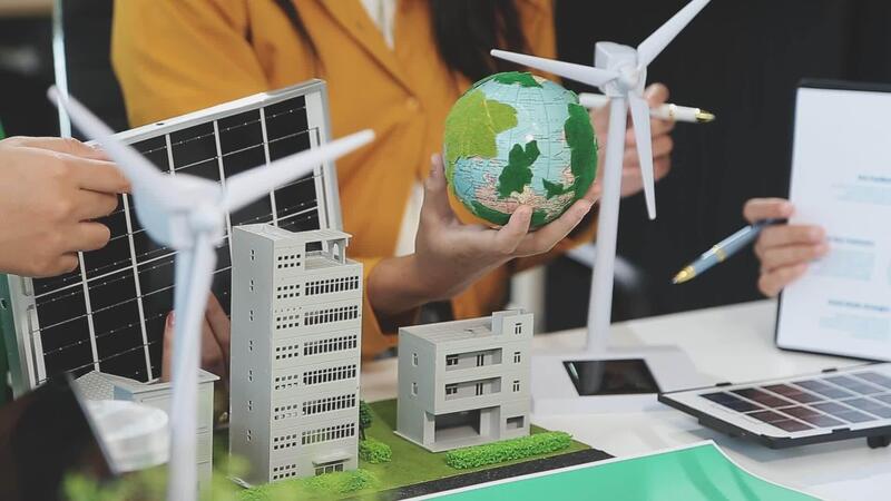 A group of people are working on a project with a model of a building and wind turbines Free Video
