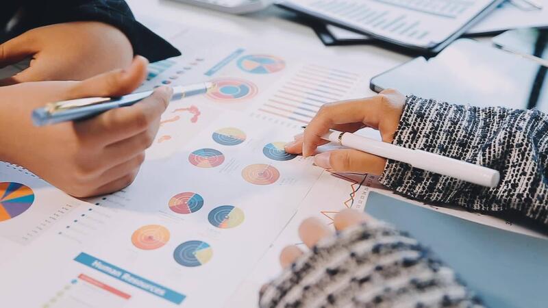 Two people are working on a document with graphs and charts Free Video