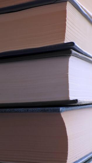 Close-up of a Stack of Colorful Old Hardcover Books in Rays of Sunlight. Camera movement from the bottom. Home collection of books on blurred background. Concept of learning, reading, and knowledge. Vertical Pro Video