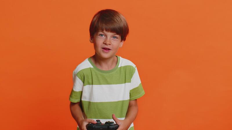 Child boy using joystick controller playing console television game enjoying success winning Pro Video