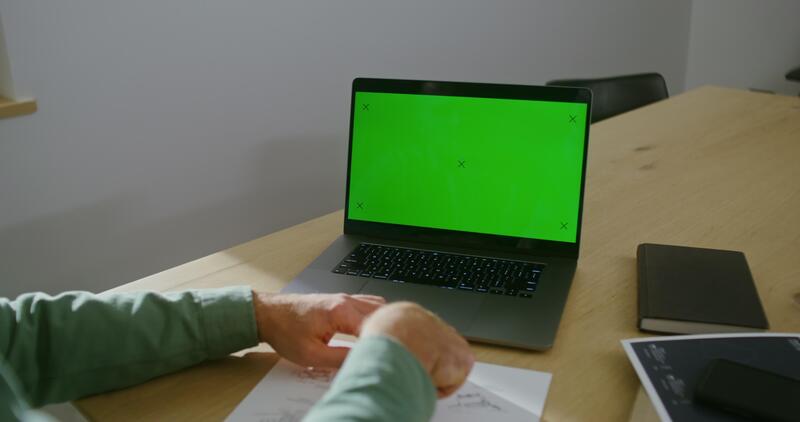 A young man of European appearance is working on a drawing, sitting in front of an open laptop with a green screen, copy space, chroma key. Young architect's desk with many papers and blueprints Pro Video