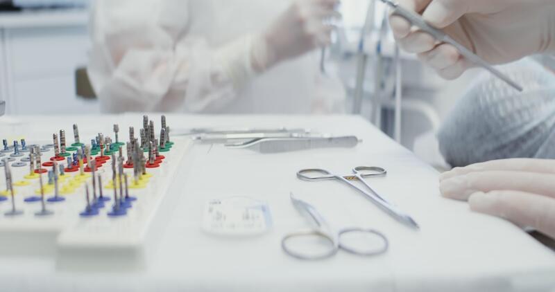 A dentist takes tool for examining a patient from a table with dental instruments laid out on it, a syringe with anesthesia, scissors and nozzles for a drill machine, close-up. in 4k, red komodo Pro Video