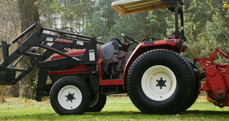 A modern agricultural tractor with a canopy above the driver's seat, with a bucket in front, stands at the edge of a field near the forest, close-up Pro Video