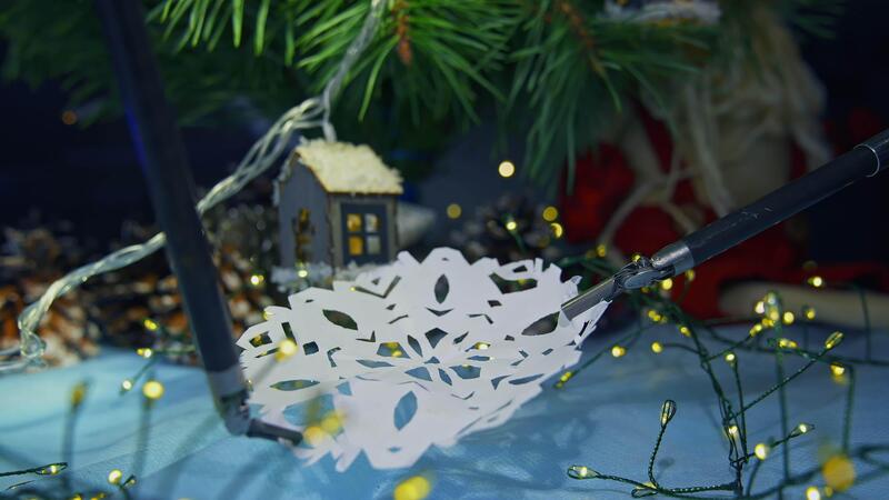 Robotic manipulators for microsurgery hold and stretch the paper snowflake. Christmas tree and ornaments at the backdrop in blur. Close up. Pro Video