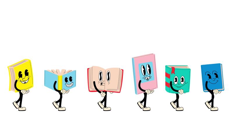 A set of groovy retro cartoon book characters walking in a seamless loop animation. Funky 70s inspired design with a transparent background for easy use in designs and overlays Pro Video