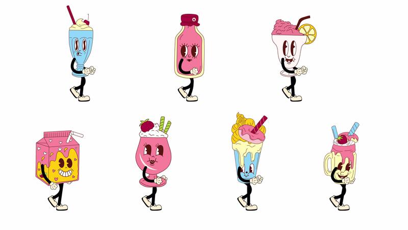 A set of groovy retro cartoon milkshake characters walking in a seamless loop animation. Funky 70s inspired design with a transparent background for easy use in designs and overlays Pro Video