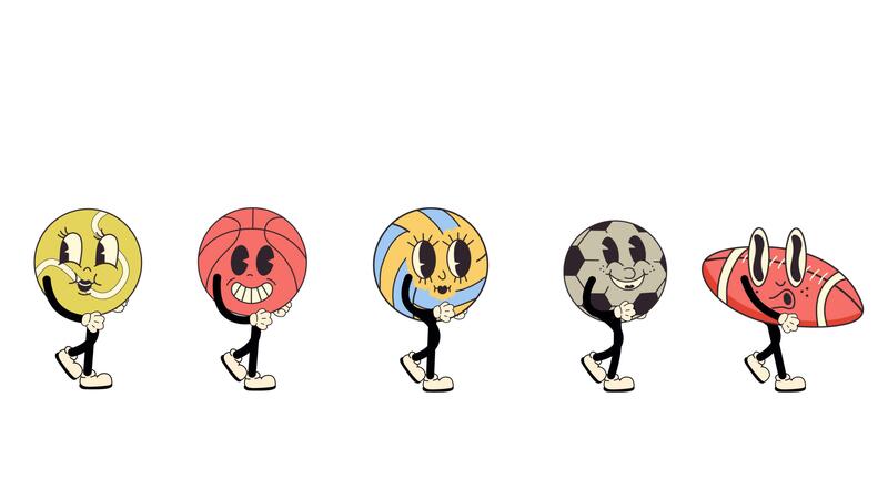 Set of retro cartoon style sport ball characters walking in a seamless loop animation. Transparent background for easy use in designs, overlays, and sports themed projects Pro Video