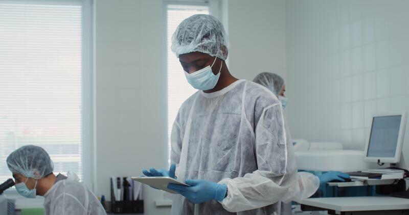 An African-American male laboratory assistant looks up from using a digital tablet and looks directly at the camera while working in a modern laboratory. 4k , red komodo Pro Video